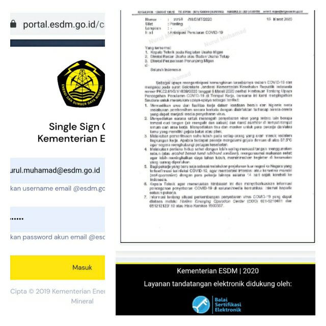- melalui portal resmi https://portal.esdm.go.id, smartphone diarahkan pada tautan aplikasi sistem otomasi persuratan yang diberlakukan di Kementerian ESDM. Aku dapat melihat surat yang telah terdisposisi ke dalam akunku. Salah satunya surat yang diregistrasi pada tanggal 13 Maret 2020.