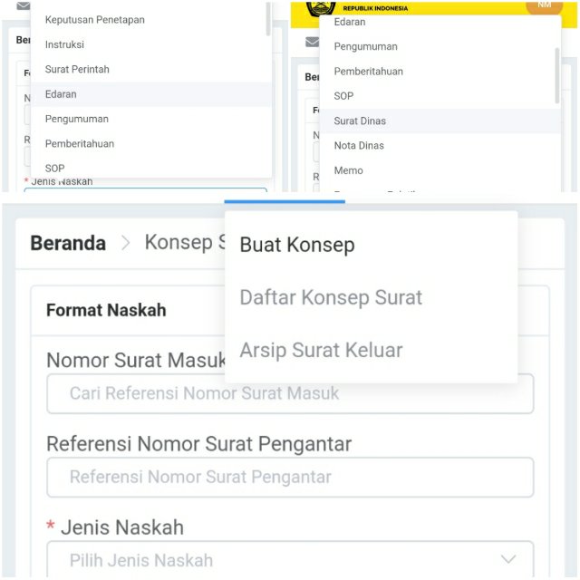 - Sosialisasi persuratan terkait pemilihan jenis naskah dinas dapat disampaikan dengan pesan pop up saat konseptor memilih jenis naskah
