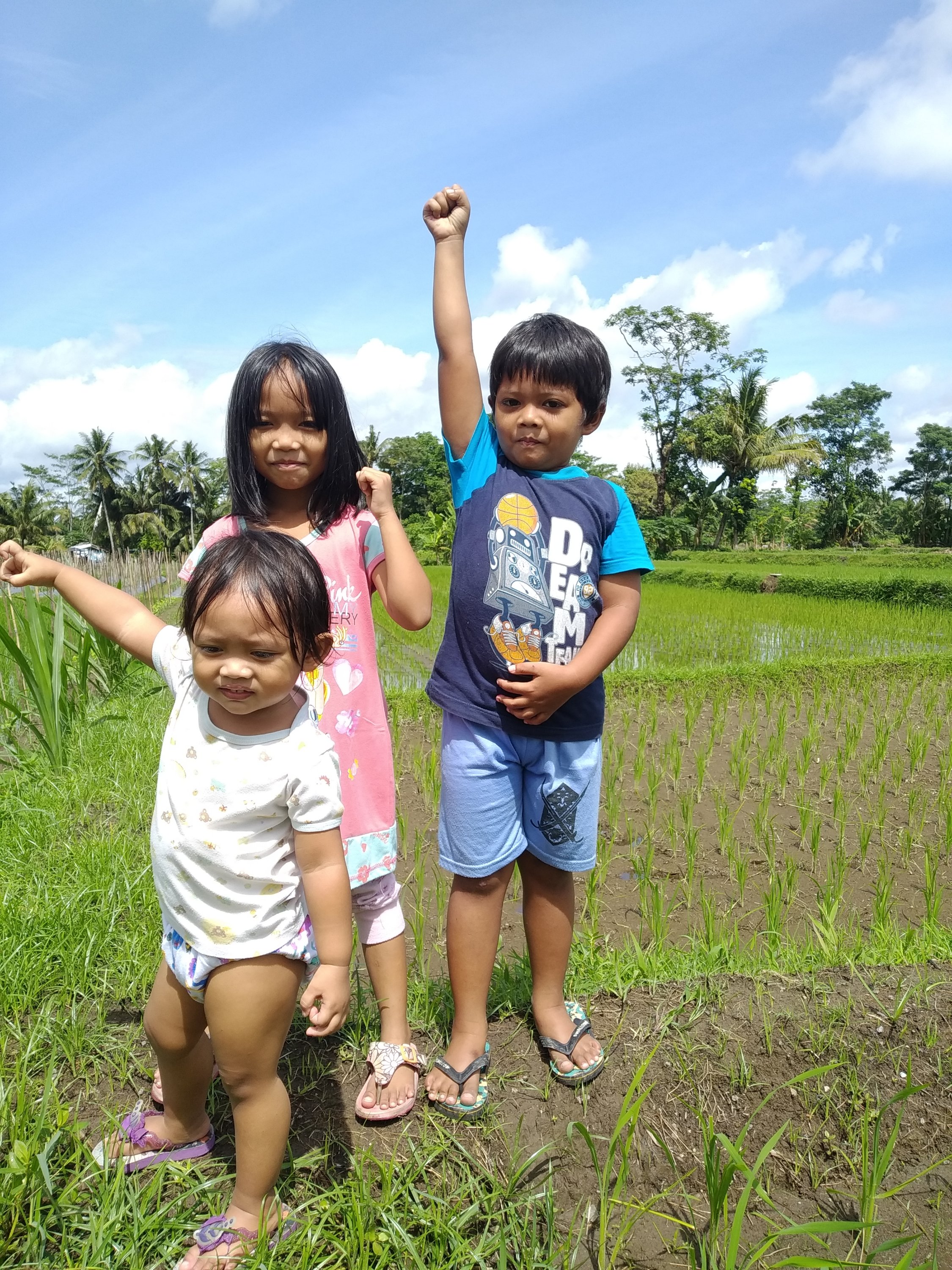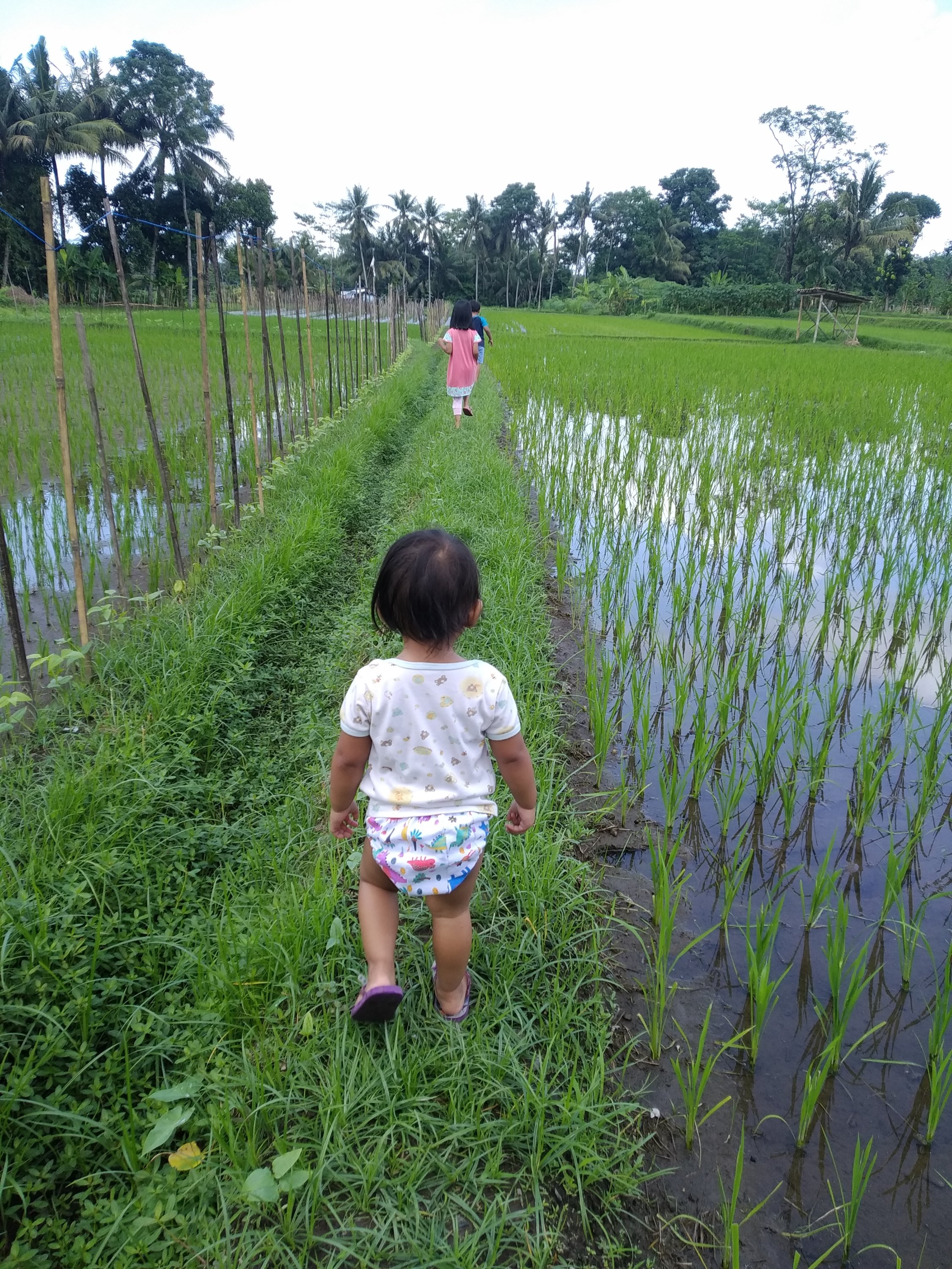 Bermain di pematang sawah, mencoba keseimbangan dengan berjalan pada parit paritnya. Menjadi pengalaman pertama mereka. Raut muka keasyikan dan kepuasan mendekat dengan alam. Meski tak seberapa dengan anak anak kuat lainnya.