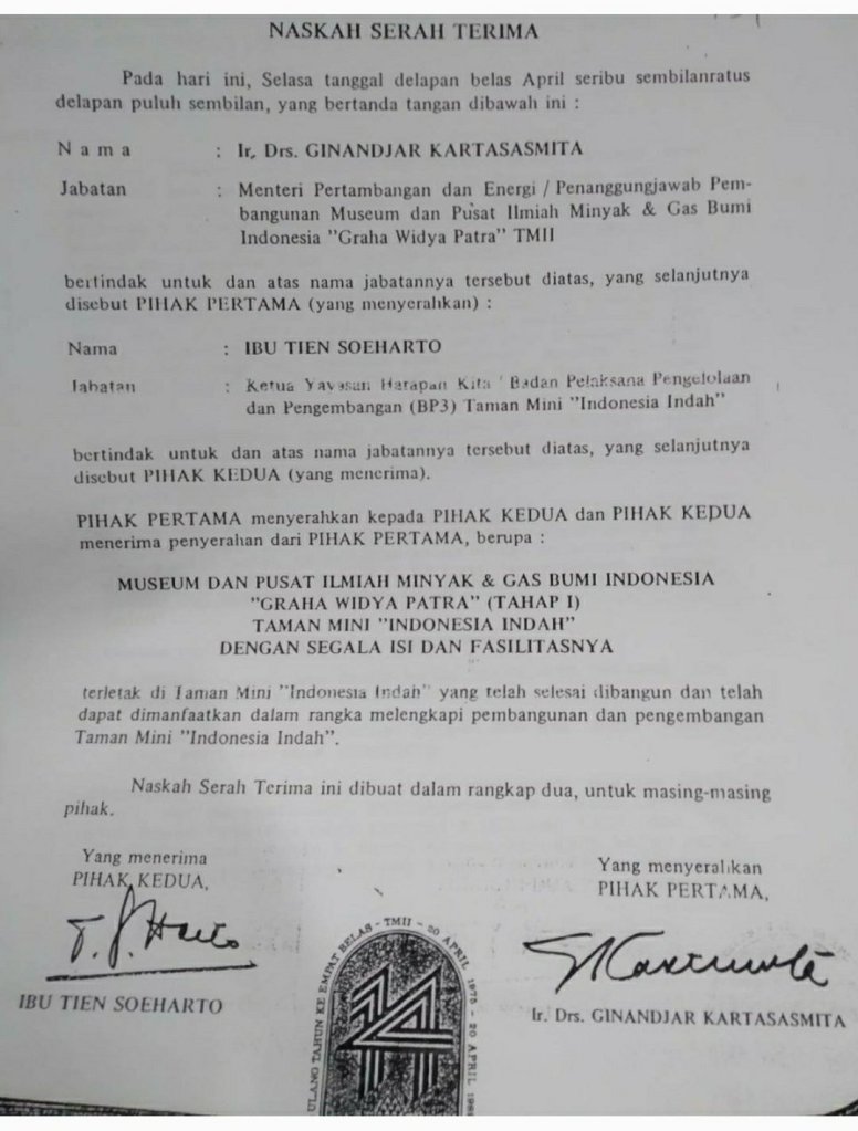 Museum yang diserahkan dalam rangka melengkapi pembangunan TMII di Jakarta ini dengan isi dan fasilitasnya. Naskah Serah Terima tersebut memiliki tingkat perkembangan “copy” (bukan asli) ditandatangani oleh Bapak Ginandjar Kartasasmita dan Ibu Tien Soeharto.