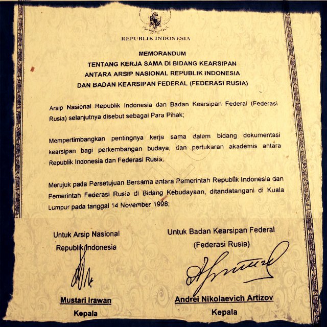 18 Mei 2016, ditandatangani Memorandum tentang Kerjasama bidang kearsipan antara Arsip Nasional Republik Indonesia dengan Badan Kearsipan federal Rusia di Sochi.