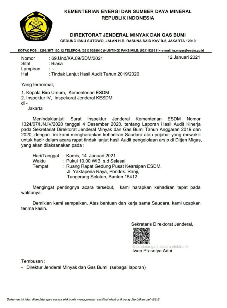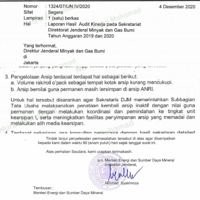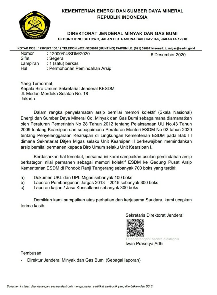 Menindaklanjuti disposisi Bapak SDM terkait Laporan Hasil Audit (LHA) Kinerja Pada Sekretariat Direktorat Jenderal Migas sebagaimana surat Inspektur Jenderal KESDM Nomor 1324/07/IJN.IV/2020 Tanggal 4 Desember 2020 pada Poin 3 terkait saran Pengelolaan Arsip disebutkan bahwa Urusan Tata usaha melakukan koordinasi pemindahan arsip ke unit Kearsipan tingkat I (Sekretariat Jenderal).