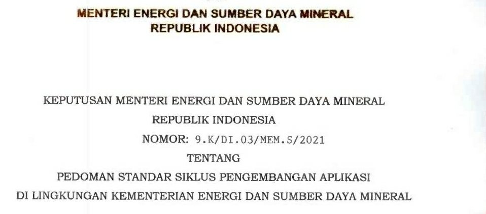 Kebijakan pemusatan pengembangan aplikasi dipertegas di tahun 2021 setelah diterbitkan penetapan Menteri ESDM Nomor 9 tentang Standar Siklus Pengembangan Aplikasi. Keputusan Menteri yang mengetengahkan Diktum Peraturan Pemerintah tentang PSTE atau Penyelenggaraan Sistem dan Transaksi Elektronik (PP Nomor 71 tahun 2019) dan juga Perpres 95/2018 tentang SPBE, menjadi acuan bagi Kementerian ESDM dalam pemanfaatan TIK demi merubah wajah Birokrasi Kementerian ESDM ke arah yang lebih efisien.