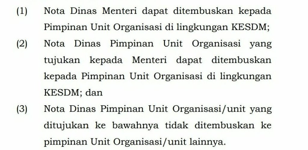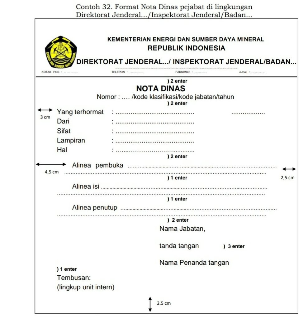 Menukil dari isi Peraturan Menteri ESDM No 02 tahun 2020 tentang Penyelenggaraan Kearsipan di Lingkungan Kementerian ESDM pada lampiran I terkait laporan, saran atau usulan, dan pemberitahuan suatu kedinasan, dapat mempergunakan Format Nota Dinas