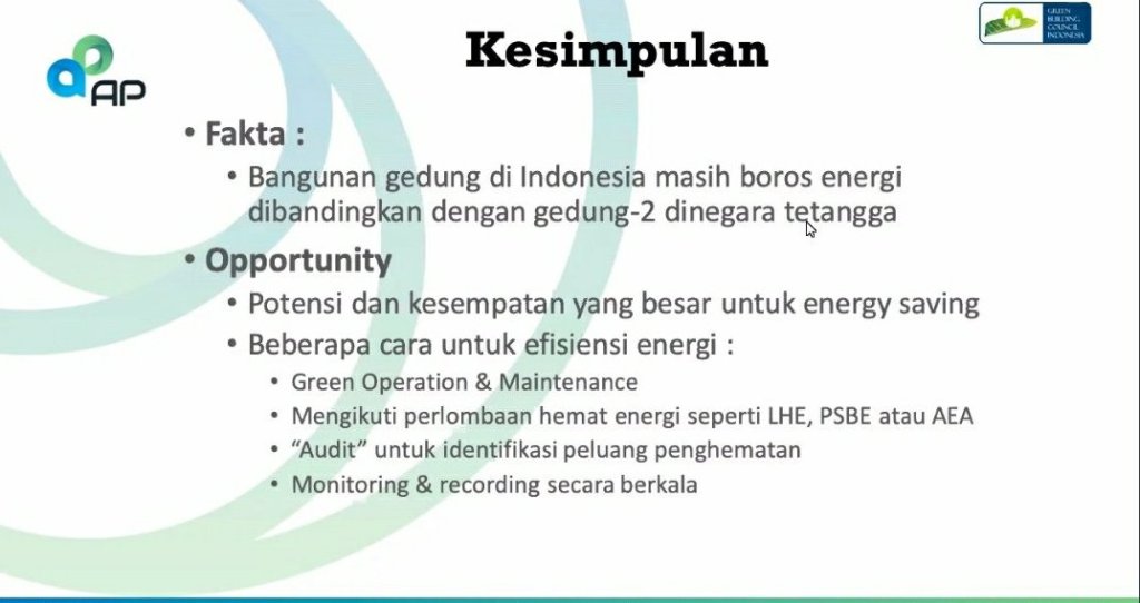 “Tantangan pengelolaan sistem tata cahaya dan tata udara pada Perkantoran berdampak pada Gedung Hemat Energi, selain perilaku para pegawai dan tim gugus hemat energi” menjadi kalimat akhir paparan narasumber pertama, Praktisi Manajemen Building Gedung Hemat Energi ( PT Arkon Pratama)