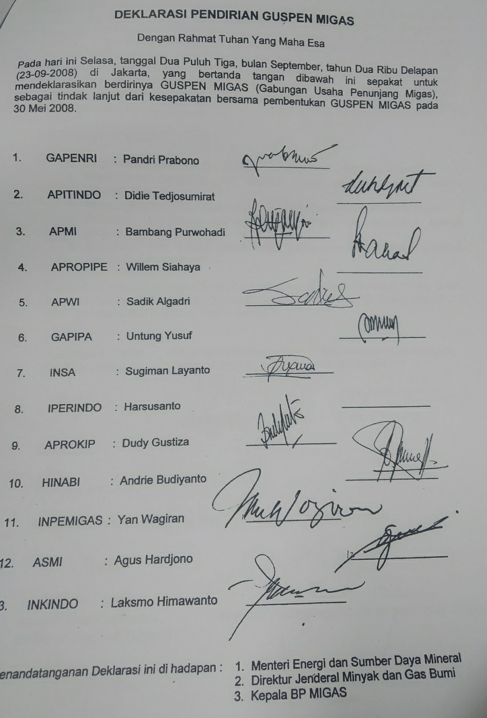 Gabungan Usaha Penunjang Migas atau yang dikenal dengan Guspenmigas didirikan bersamaan Penandatanganan deklarasi dihadapkan Menteri ESDM, pada tanggal 23 September 2008 disaksikan pula oleh Dirjen Migas dan Kepala BPMigas. Wujud kesepakatan bersama berbagai asosiasi perusahaan penunjang Migas antara lain GAPENRI, APITINDO, APMI, APROPIPE, APWI, GAPIPA, INSA, IPERINDO, APROKIP, HINABI, IPENMIGAS, APMI, INKINDO pada tanggal 30 Mei 2008.