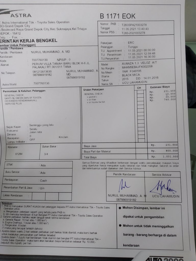 “Terima kasih Mas Ucu Lahamudin”. Berkat penawaran sales advisor, aku tak harus merogoh kocek terlalu dalam. Paket perawatan kendaraan yang dapat kulakukan hanya dengan General Chek Up seharga 231.000 rupiah yang seharusnya di poin 700 – 800 ribu.