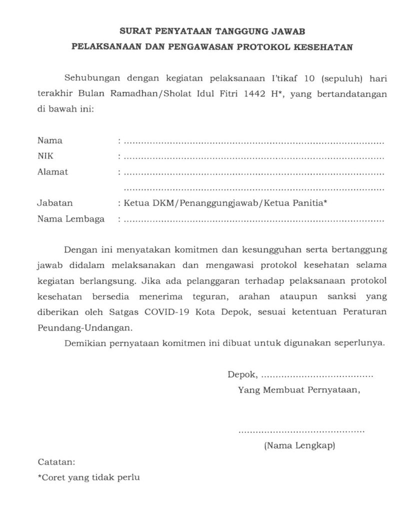 Protokol Kesehatan Ditulis olehNurul MuhamadMei 15, 2021Diposkan padaCovid-19Tag:Pandemi Surat Pernyataan Tanggung Jawab Pelaksanaan dan Pengawasan Protokol Kesehatan.( Sumber: SE Walikota Depok) Bagikan ini: Bagikan ke X(Membuka di jendela yang baru) X Bagikan pada Facebook(Membuka di jendela yang baru) Facebook Suka Memuat... Terkait Diterbitkan oleh Nurul Muhamad Pencerita dan Pencari Makna Lihat lebih banyak pos
