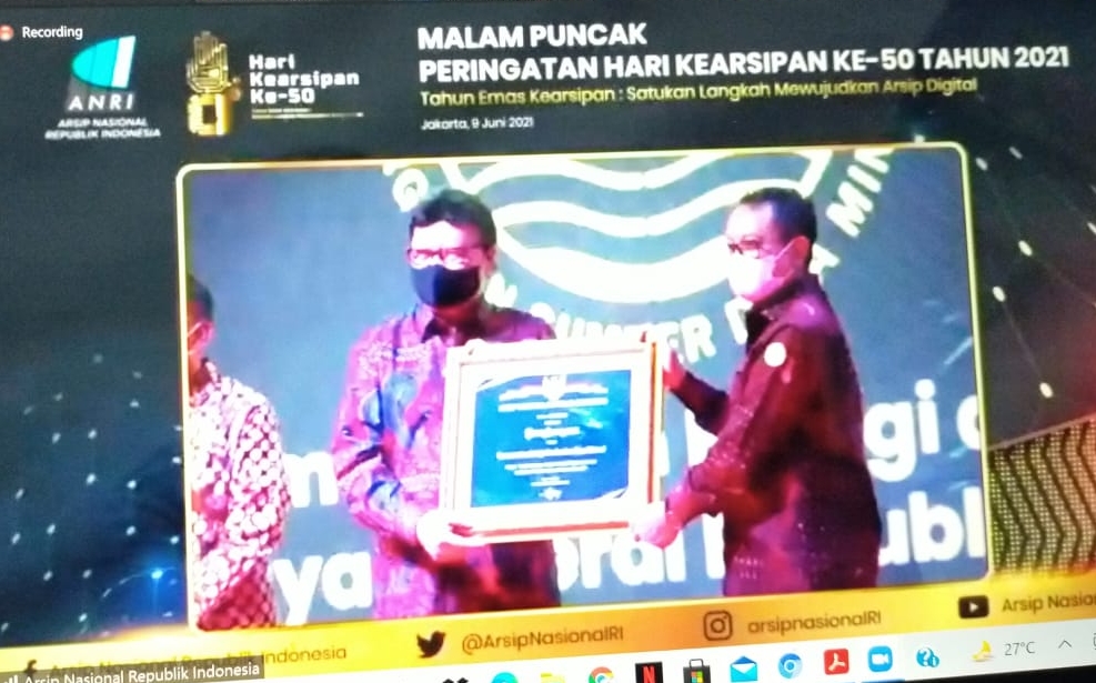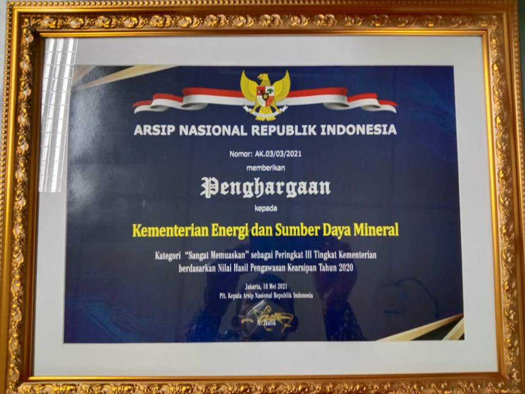 “Saya mendampingi pak Endang Sutisna” katanya. Dan benar, perwakilan Kementerian ESDM dipanggil ke panggung untuk menerima penghargaan kinerja Kearsipan di Tahun 2020 pada peringkat Tiga Besar (Kategori Kementerian). Menteri PAN &RB pada kabinet Indonesia Maju menyerahkan penghargaan dengan disaksikan Plt. Kepala ANRI kepada Kepala Biro Umum Kementerian ESDM.