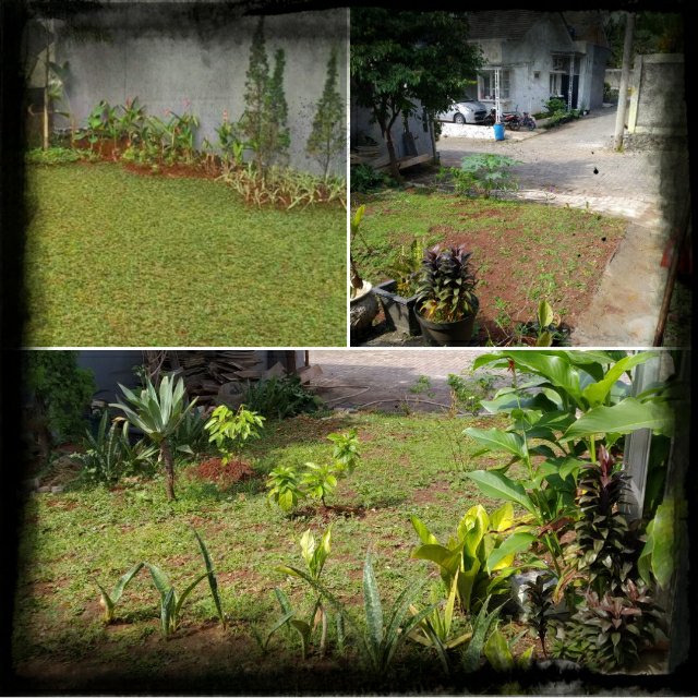 Sejak kutanam beberapa potong rumput dari potekan dan sisa taman tetangga, serta yang kucobgkel dari taman fasos depan, kulengkapi dengan mendatangkan dari penjual meski hanya 35 ribuan. Hanya butuh kesetiaan dan rasa penerimaan, rumput pun telah tumbuh menghijau menyejukkan pemandangan.