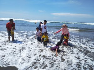 Tak kalah pula dengan si Bontot, kali perdana menginjakkan kaki diatas pasir pantai, Rara pun tenggelam dengan keasyikan bermain dengan alam. Ombak yang bergulung gulung serta air laut dengan pasir yang lembut begitu asyik untuk dijadikan arena bermain ketiga anaku.