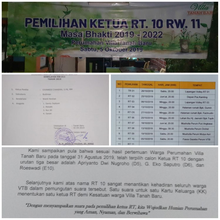 Masa Bhakti yang kedua setelah tahun 2016-2019, segera disambut oleh Ketua RT 10 terpilih. Menyambut Masa Bhakti 2019-2022, Perumahan Villa Tanah Baru yang menjadi RT 10 akan menjalani jadwal pemungutan suara pada Hari Sabtu, 5 Oktober 2019.